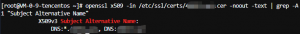 $ openssl x509 -in /etc/ssl/certs/example.com.cer -noout -text | grep -A1 “Subject Alternative Name”